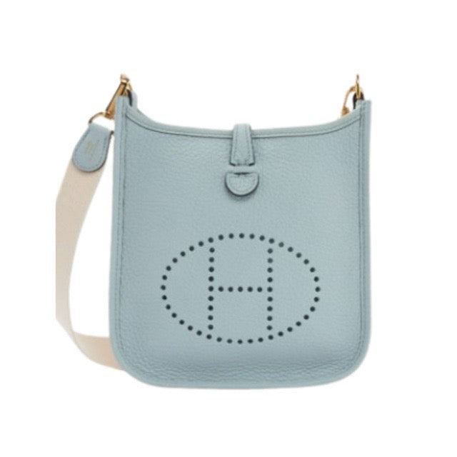 HERMES MINI EVELYNE TPM AMAZONE SHOULDER BAG BLEU PALE ETAIN TAURILLON CLEMENCE GOLD HARDWARE