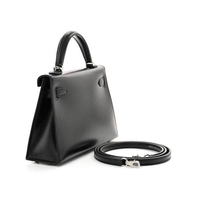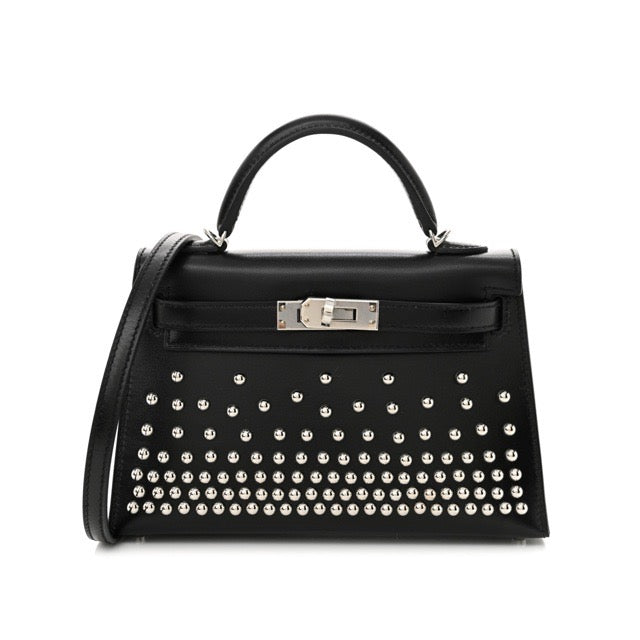 HERMES MINI KELLY 2 SELLIER 20 CLOUTE LIMITED EDITION BLACK BOX CALFSKIN SILVER HARDWARE