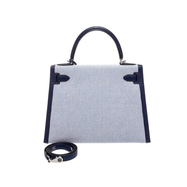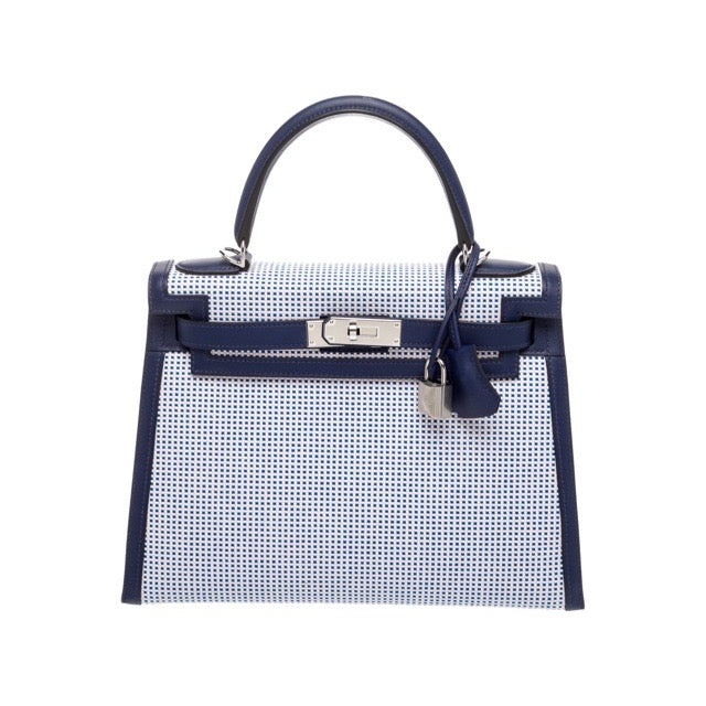 エルメス ケリー28 外縫い マルチカラー ブルーサフィール エクリュ トワルキャドリーユ キャンバス スイフト シルバー金具 HERMES KELLY SELLIER 28 BLEU SAPHIR ECRU TOILE QUADRILLE CANVAS SWIFT SILVER HARDWARE