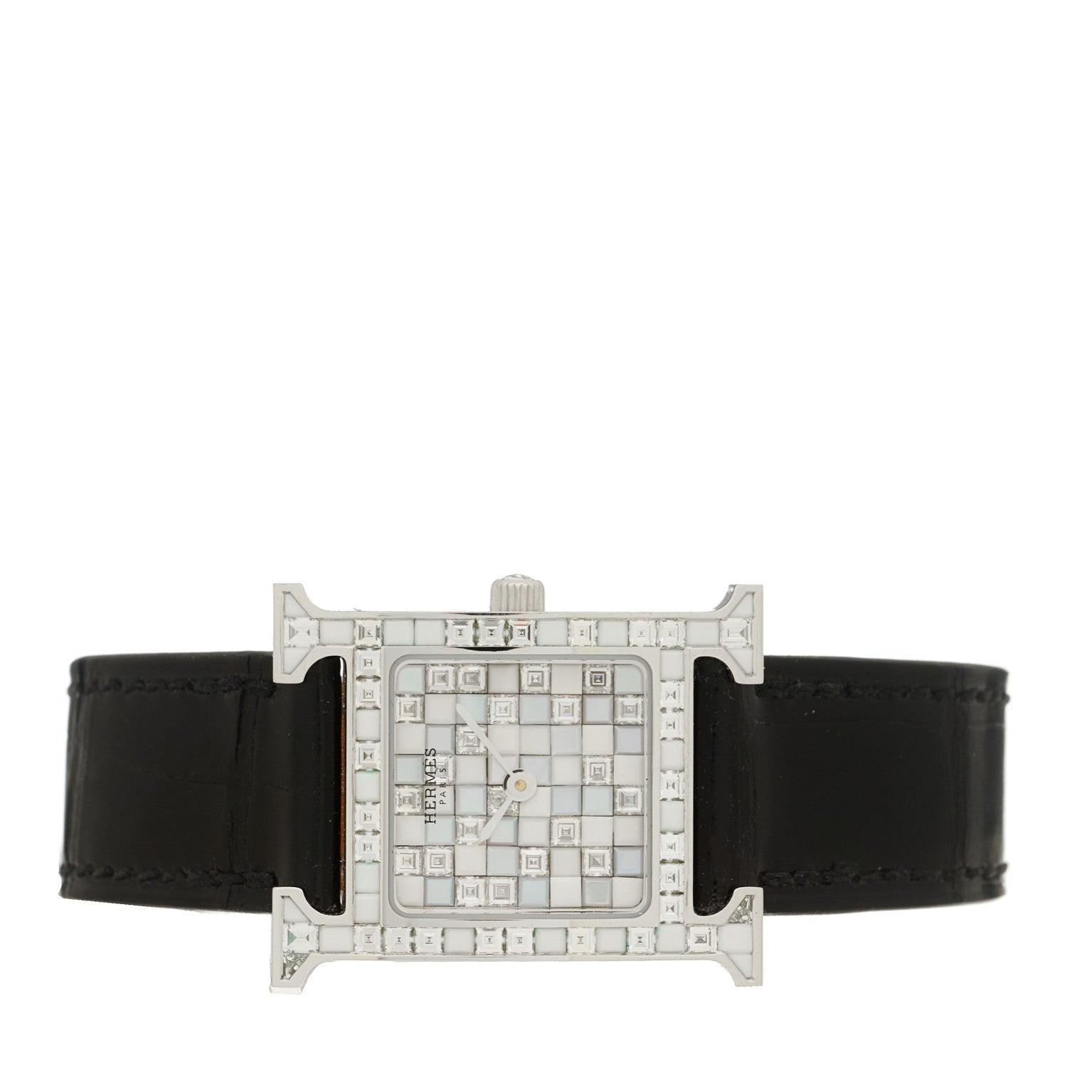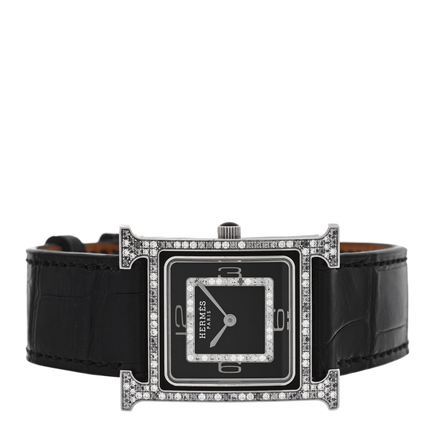 エルメス 18K ホワイト ゴールド アリゲーター ダイヤモンド 21mm ウール H アワー モザイク ジョアイリエール クォーツ ウォッチ 腕時計 ノワール